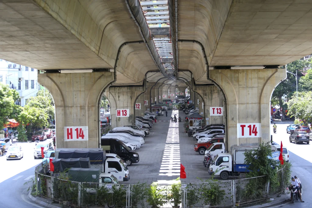 Dưới chân cầu vượt, đoạn gần Đại học Giao thông Vận tải, được tận dụng làm điểm trông giữ ôtô, quy mô khoảng 100 chiếc.